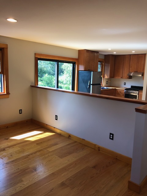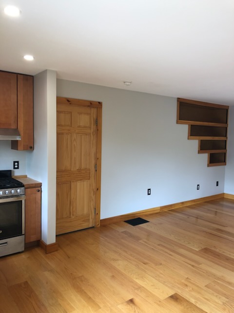 Small modern studio apartment above garage with wide open layout. Unfurnished. Potential for washer/dryer in garage within a few months (not included initially); no access to the garage below. Heat, A/C and electric included in rent.